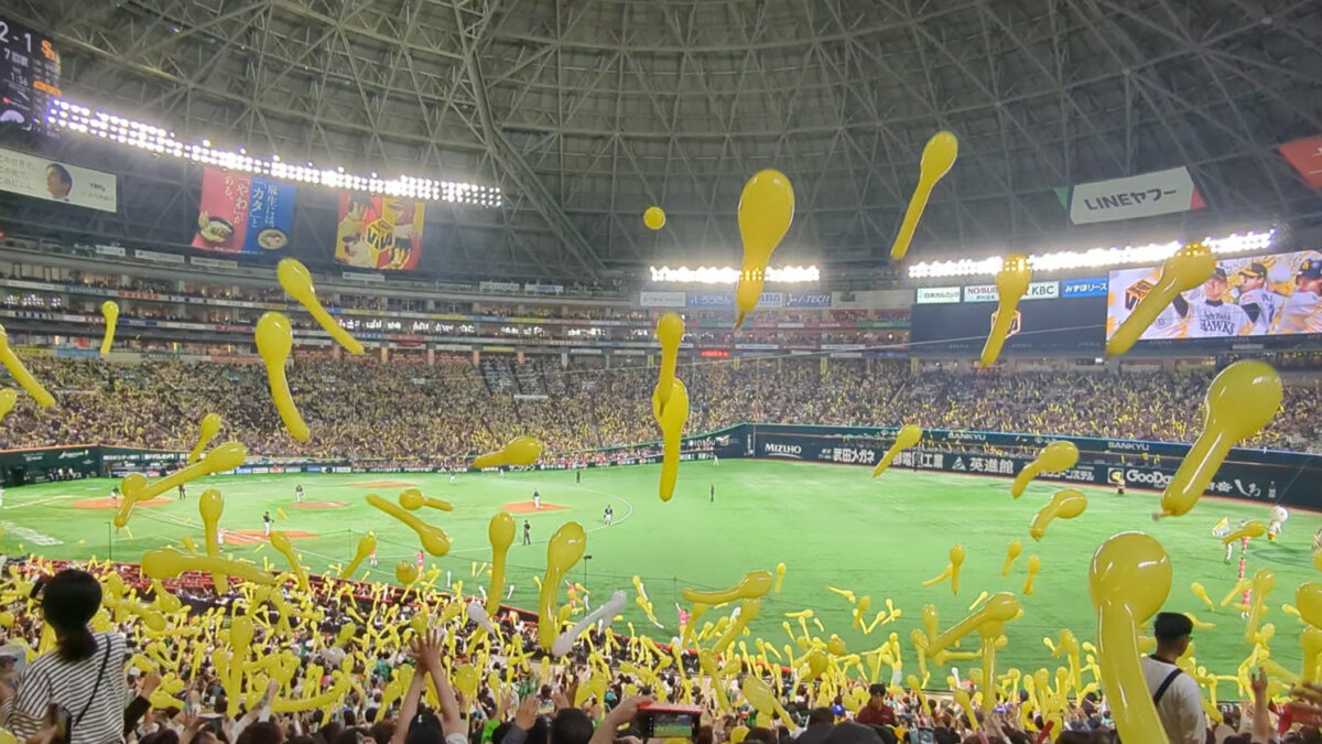 慕名已久的黃色風船!在第七局上半結束後,球迷會先合唱「いざゆけ若鷹軍団」,再一齊放出黃色氣球,場面非常壯觀。